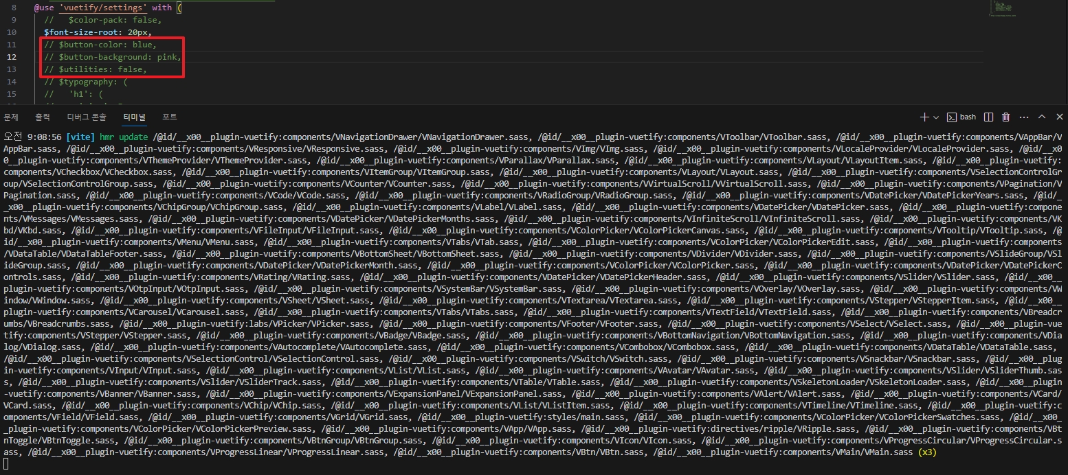 SCSS 공통 속성 수정은 최초에만 작업할 예정이긴 하지만, 추후 어떤 문제를 야기시킬지 짐작할 수 없기 때문에 Vuetify의 치명적인 단점으로 다가왔다. (* 간혹 저장 시 Vite(빌드 & 스캐폴딩 도구)가 다운되는 일도 빈번했다.)