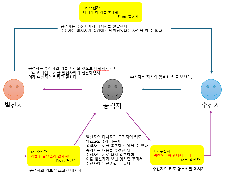 발신자가 수신자에게 메시지를 보낼 때, 공격자가 메시지를 중간에서 가로채는 것