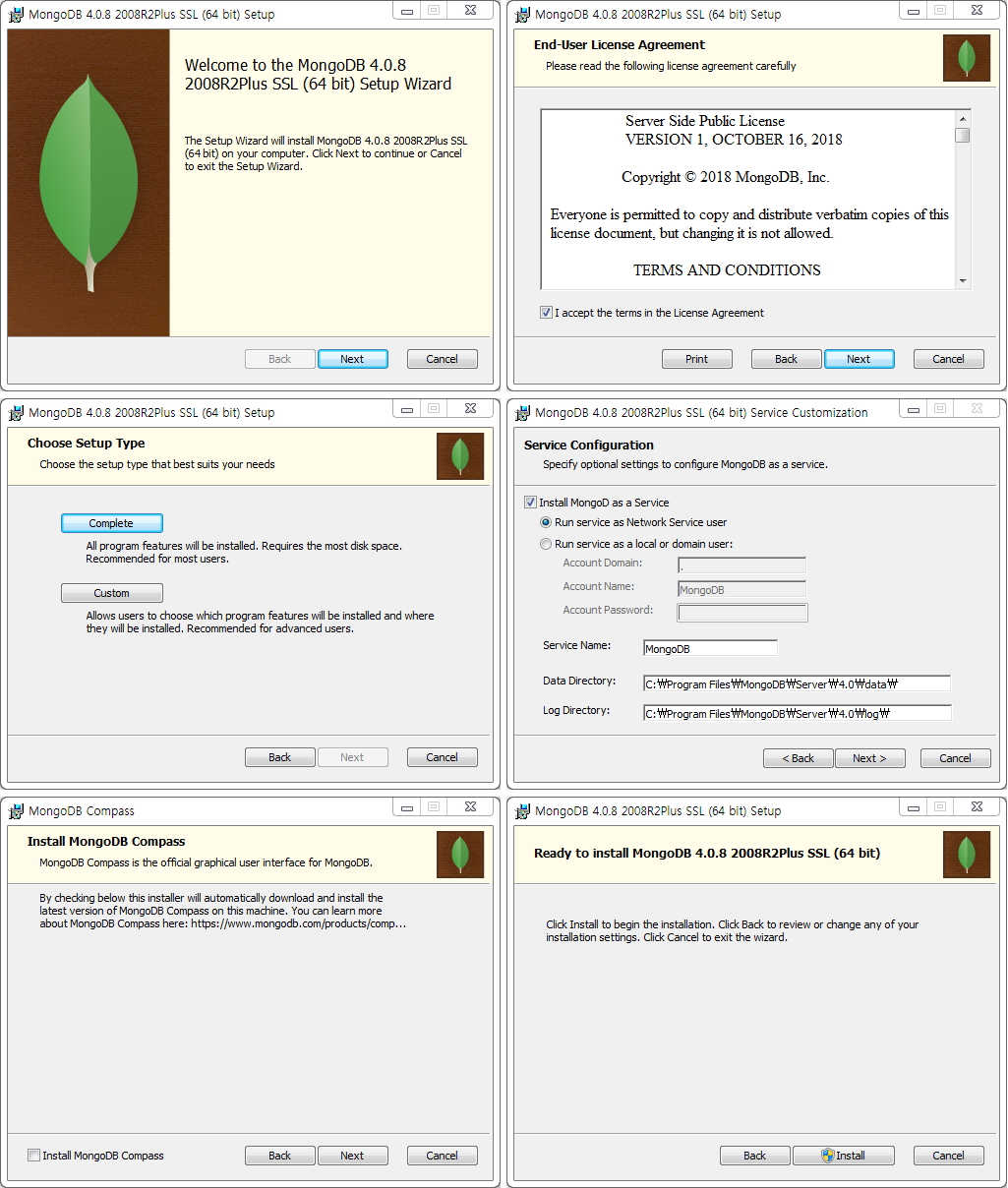 ===> MongoDB 4.0부터는 설치하는 동안 Windows 서비스로 설치 및 구성하고 시작할 수 있으며, 성공적으로 설치하면 MongoDB 서비스가 시작된다.