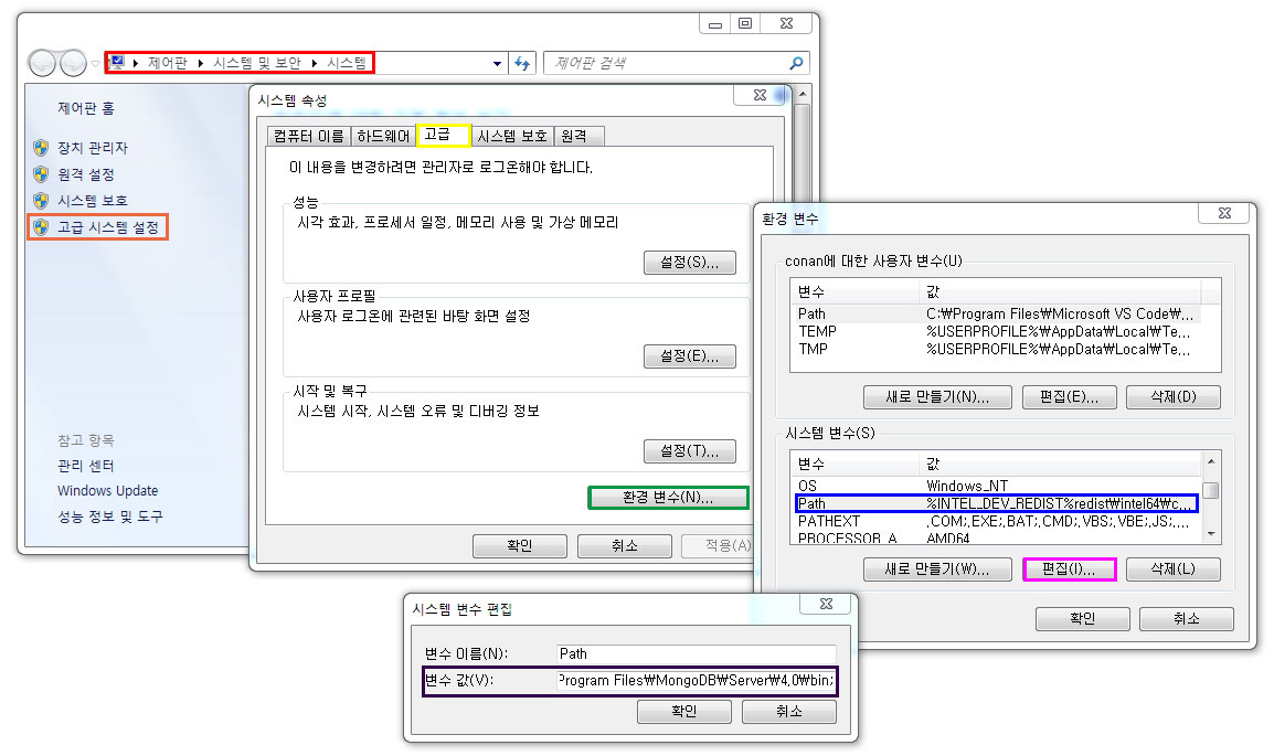 제어판 > 시스템 및 보안 > 시스템 > 고급 시스템 설정 > 고급 >