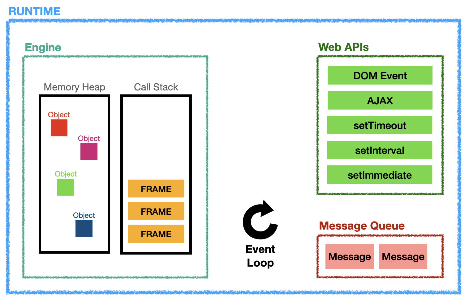 - Web APIs, Message Queue(= Event Queue)와 Event Loop가 비동기 처리를 해준다.